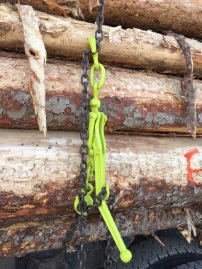 - When open, geometry allows handle to stand upright when attaching to the chain on a log bundle wrapper